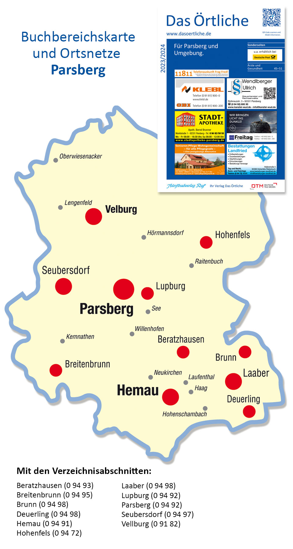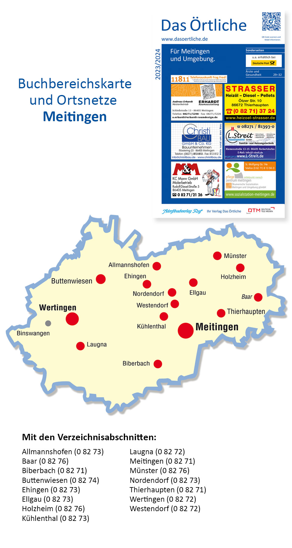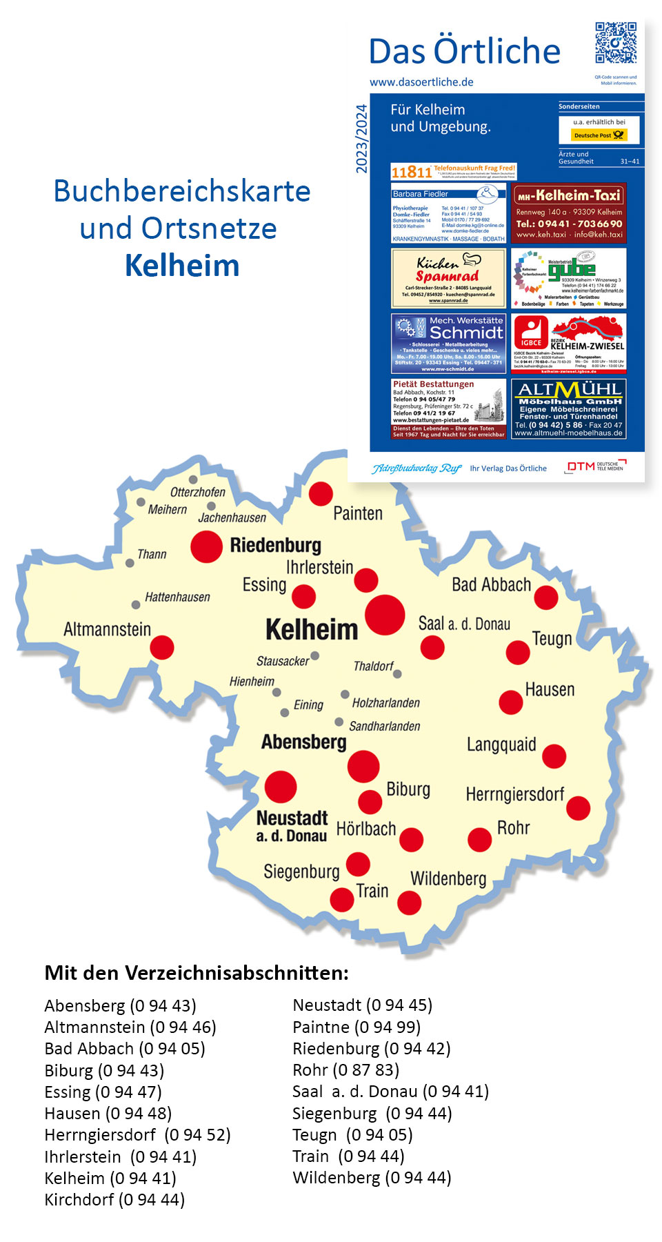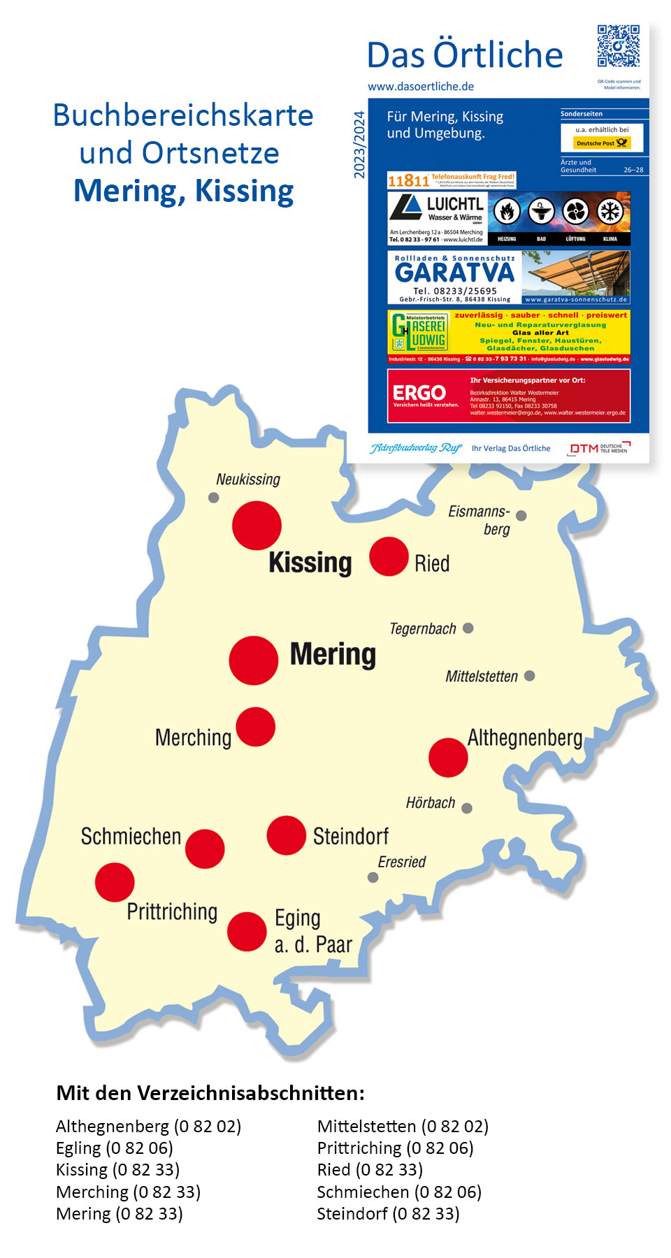 Nachfolgend finden Sie eine Aufstellung der von uns betreuten Ausgaben für Das Örtliche. Diese gelten neben den gedruckten Buchausgaben auch für die entsprechenden Einträge auf www.dasortliche.de. Gerne helfen wir Ihnen weiter, wenn Sie Fragen zu Insertionsmöglichkeiten oder zu Ihrem Eintrag aus unserem Verbreitungsgebiet haben.