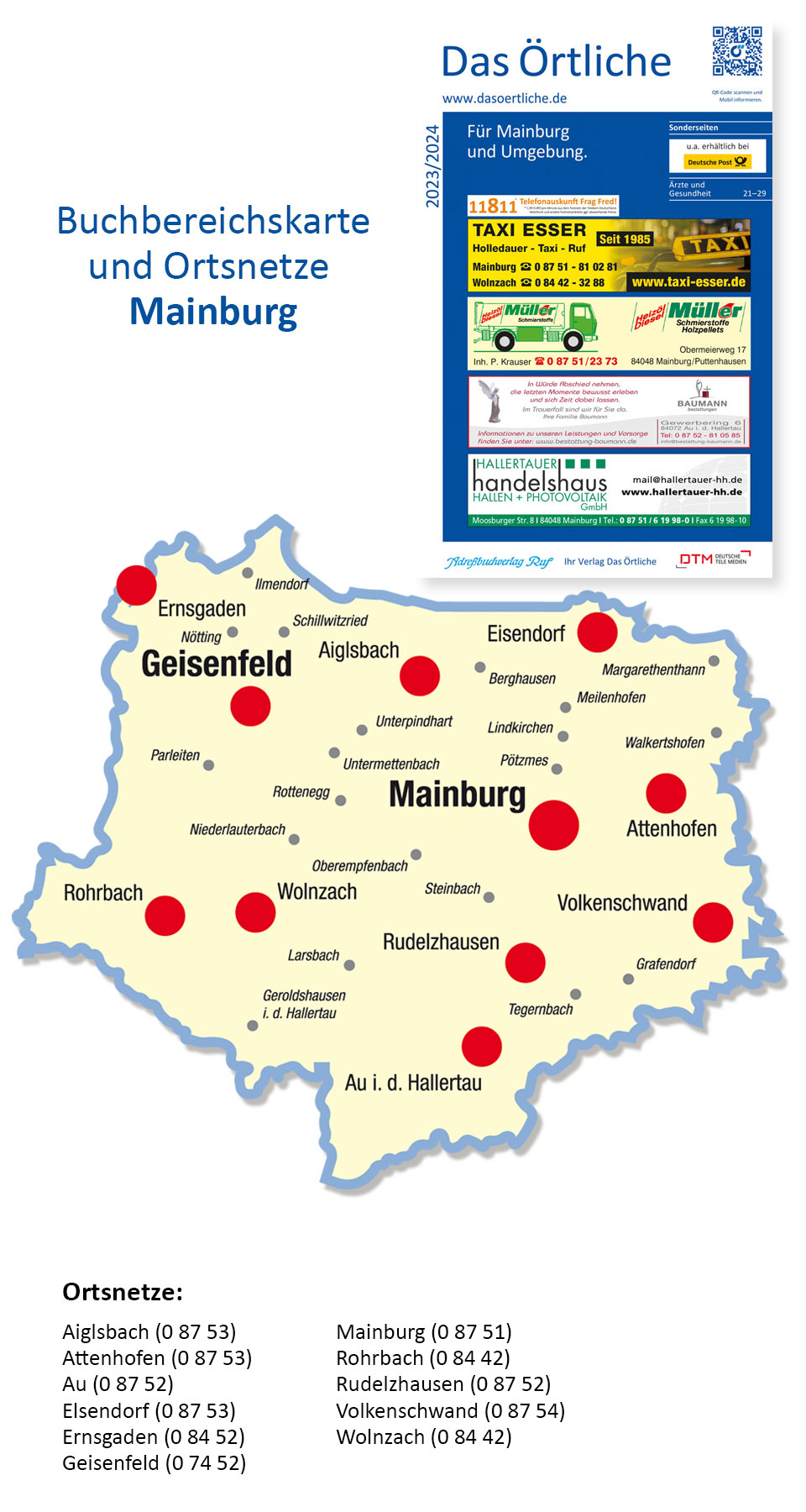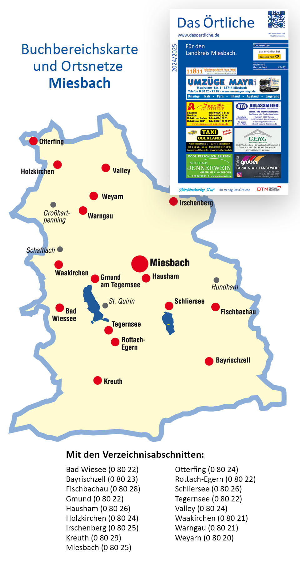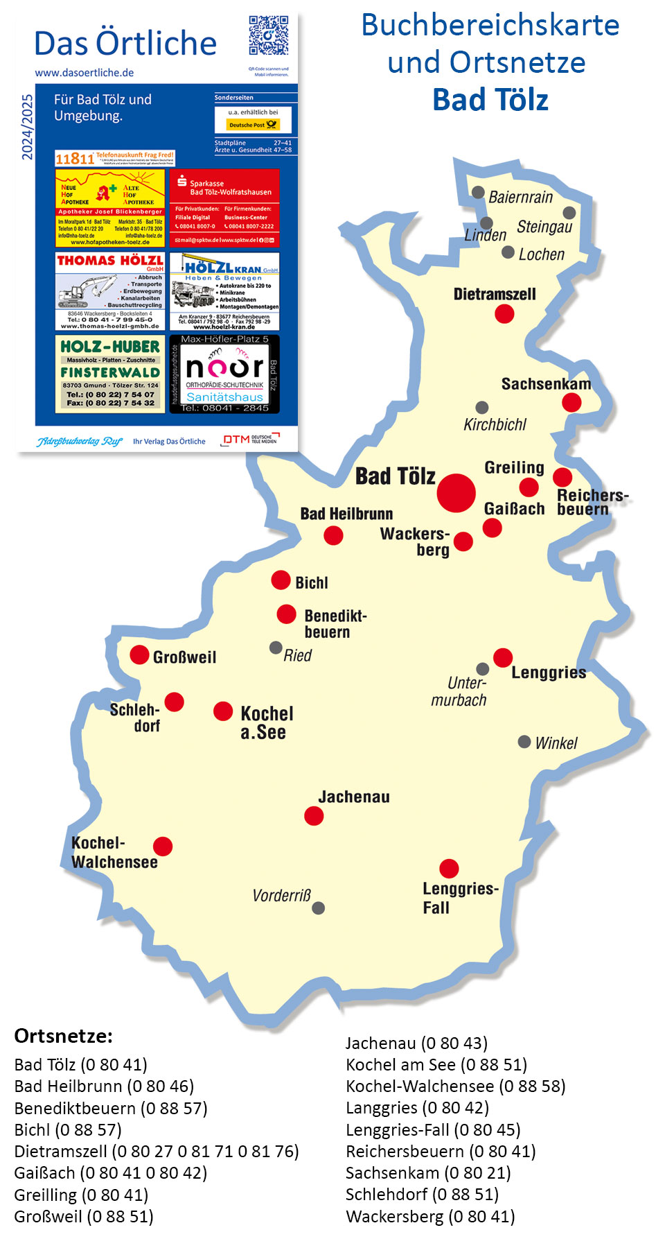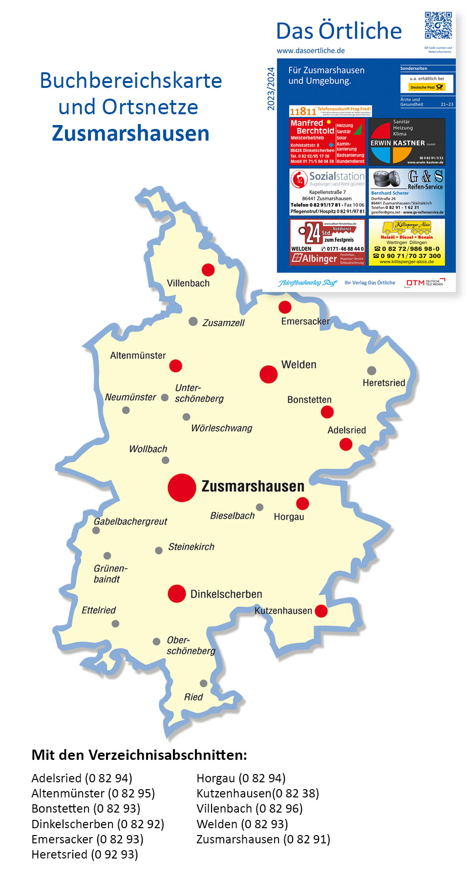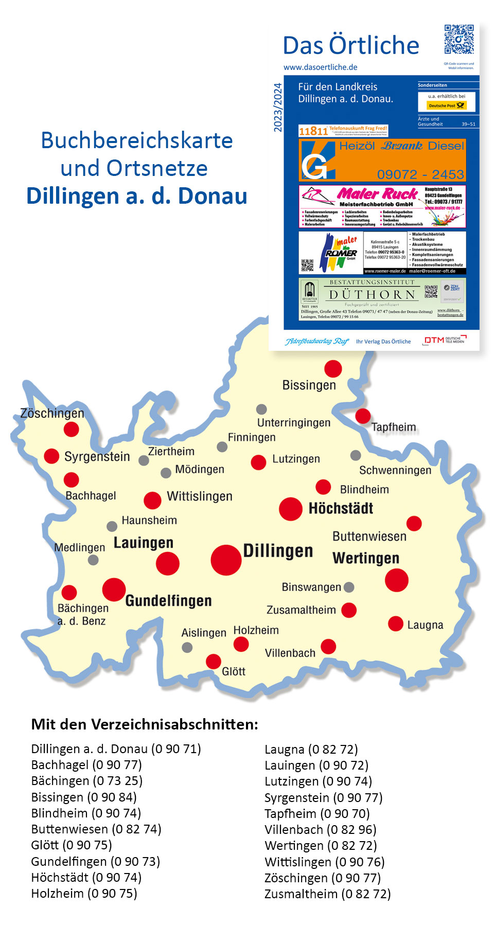 Nachfolgend finden Sie eine Aufstellung der von uns betreuten Ausgaben für Das Örtliche. Diese gelten neben den gedruckten Buchausgaben auch für die entsprechenden Einträge auf www.dasortliche.de. Gerne helfen wir Ihnen weiter, wenn Sie Fragen zu Insertionsmöglichkeiten oder zu Ihrem Eintrag aus unserem Verbreitungsgebiet haben.